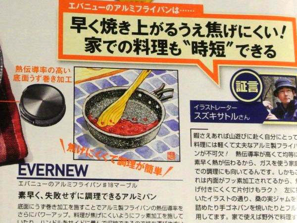 世界文化社 『アウトドアウェア&ギア リアル買いLIST』特集「達人が証言!山用ギアは 外⇔内兼用目線で選べば快適」のコーナーで野外と家でのアルミフライパンのボクなりの使い勝手の記事と、エバニューさんのアルミフライパンの絵を描かせていただきました。