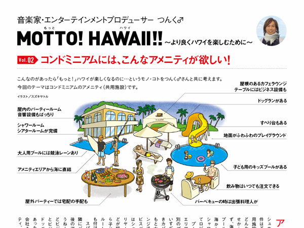 ハワイ・ホノルルで配布されているロングステイ・移住・暮らしの情報マガジン 「ハワイに住む」のつんく♂さんの連載ページ「MOTTO!HAWAII」のイラストを描きました。